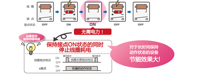 磁保持繼電器是近幾年發(fā)展起來的一種新型繼電器,也是一種自動開關(guān)。和其他電磁繼電器一樣,對電路起著自動接通和切斷作用。所不同的是,磁保持繼電器的常閉或常開狀態(tài)完全是依賴永久磁鋼的作用,其開關(guān)狀態(tài)的轉(zhuǎn)換是靠一定寬度的脈沖電信號觸發(fā)而完成的.線圈通電時,接點處于on或者off狀態(tài),即使切斷線圈電壓仍能保持該狀態(tài)的功能。在設(shè)備的動作狀態(tài)下,停止線圈耗電,實現(xiàn)節(jié)能。這一類的繼電器,叫做磁保持繼電器;